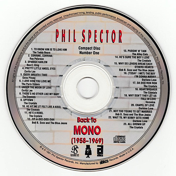 CD 1 to 3 is titled "Back To Mono (1958-1969)" (P) & (C) 1991 Phil Spector Records, Inc. CD 4 is titled "A Christmas Gift For You" (P) 1963 and (C) 1989 Phil Spector Records, Inc. Box set includes a 96 page book, with essays by Tom Wolfe and David Hinckley, lyrics, credits and photos. Set also includes a 'Back To MONO' badge. Made in the U.S.A. Variant 2: the letters in the "other" fields are stamped on the inner hubs of the discs.