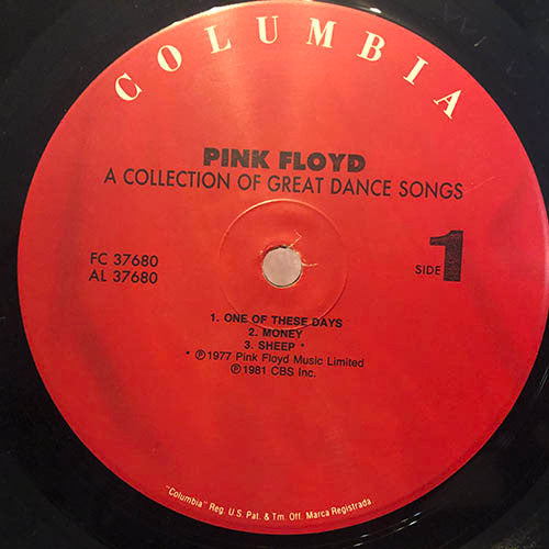 1990s repress with red Columbia labels. This album contains previously released material. A1: From "Meddle" - 1971. Recorded at Morgan Studios 1971. Mixed at Air Studios London 1971. A2: Originally from "Dark Side Of The Moon", re-recorded at New Roydonia Studios 1981. Mixed at Producers Worskhop L.A. 1981 A3: From "Animals" - 1977. Recorded and mixed at Britannia Row Studios London 1977. B1 & B2: From "Wish You Were Here" - 1975. Recorded and mixed at Abbey Road Studios London 1975. B3: From "The Wall" - 1979. Recorded at Superbear, France and Producers Workshop L.A. Mixed at Producers Workshop L.A. Kids recorded at Britannia Row, London. A1, A2 & B3: ℗ 1981 CBS Inc A3: ℗ 1977 Pink Floyd Music Limited B1: ℗ 1975 Pink Floyd Music Limited B2: ℗ 1979 Pink Floyd Music Limited "Columbia" Reg. U. S. Pat & Tim Off. Marca Registrada.