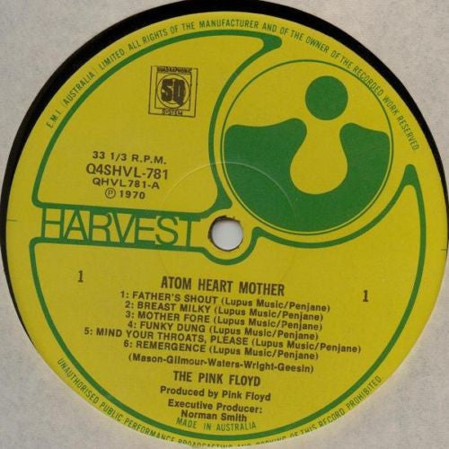 2nd variant of the Australian Quad. pressing. - Labels credit 'The Pink Floyd' - Different font used for the text on the label - Cover incorrectly gives the Stereo catalogue number. - Cover is not laminated