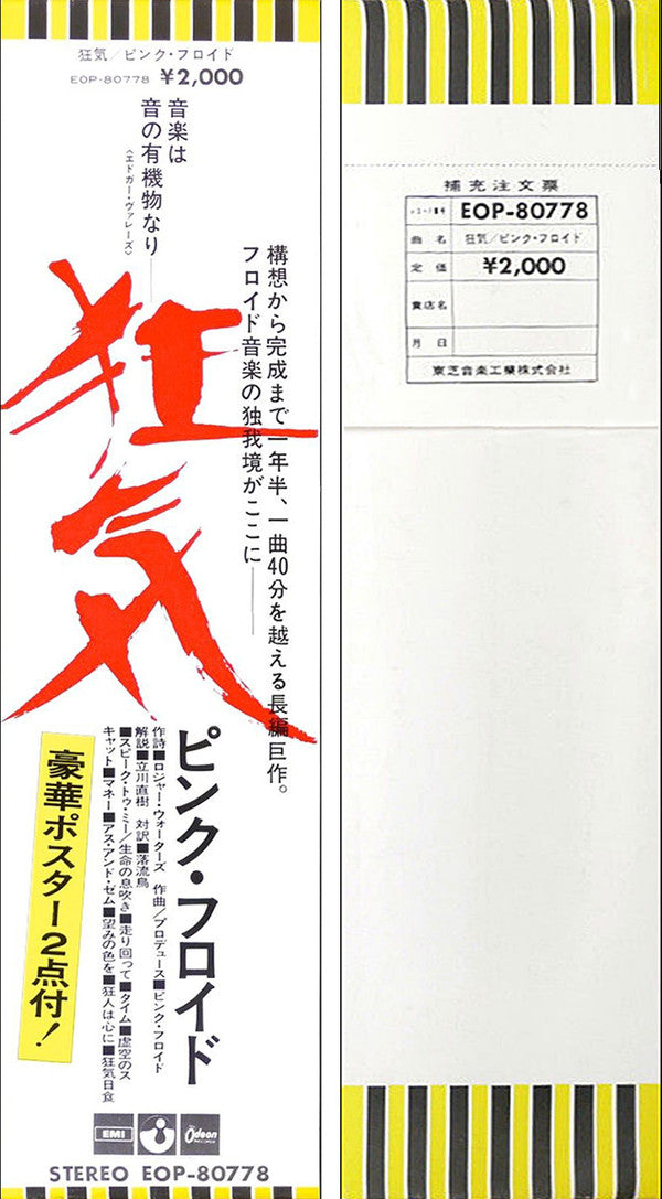 Japanese initial 1st pressing release. Has price ¥2000 printed on the obi. Also price ¥2000 printed inside the gatefold under Emi/Harvest/Odeon logo Music is denoted A to G from side 1 thru side 2 not numbered A1, A2..B1, B2.... etc. Comes With: - art postcard (EOP-80778 appears on bottom right hand) - Japanese OBI with ¥2000 price - 32-page booklet - 2 posters Duration times do not appear on label, cover, booklet or inserts.