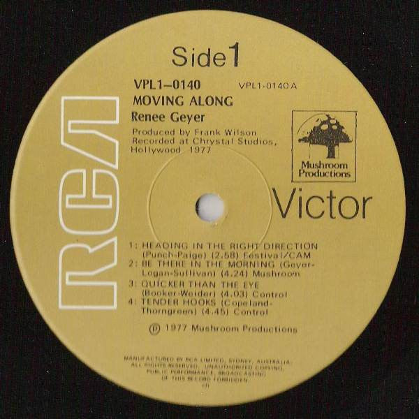℗ 1977 Mushroom Productions Available On Cassette VPK1 0140 Special Thanks To: Michael Gudinski and Mushroom Records. Recorded & Mixed at Crystal Sound Recording A Spec-O-Lite Production A Bunyip International, Ltd. A1: Festival/CAM A2: Mushroom A3,4: Control B1: Screen Gems/Castle B2,4: Screen Gems B3: Castle Release date code on lower RH rear corner A677F