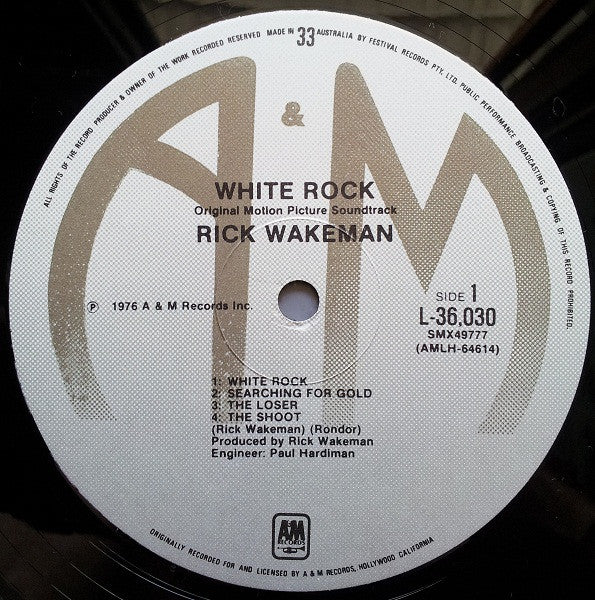 "Mellotron" misspelt as "Mellontron" on track B1 Sleeve: White Rock: The Original Motion Picture Soundtrack Of The Innsbruck Winter Olympics Tracks A1 to B1, B4 Recorded and mixed at Advision Track B2 Grand Piano (Recorded at the Music Centre), Moog Synthesizers, Mellotron (Recorded and mixed at Advision). Track B3 Recorded at Music Centre. Mixed at Advision. With many thanks to Tony Maylam, Gordon Swire and Michael Samuelson. Recorded between January 1976 and September 1976. Cut at Trident Studios. All tracks are based on the music from the film "White Rock". ℗ 1977 A & M Records Inc. Manufactured and distributed under licence by Festival Records Pty. Limited, Australia. A & M and Design is the registered Trademark of A & M Records Inc. Hollywood Calif., U.S.A. and used by Festival Records Pty. Limited, under authorization. Labels: ℗ 1976 A & M Records Inc. Made in Australia by Festival Records Pty. Ltd. Originally recorded for and licensed by A & M Records, Hollywood California