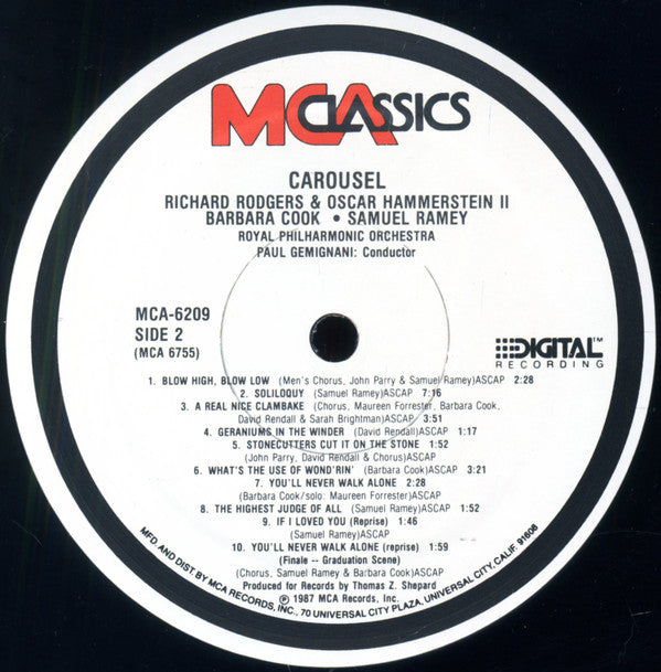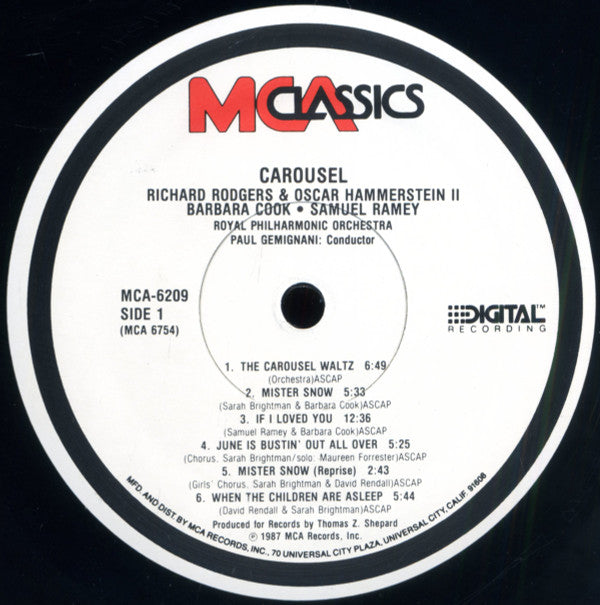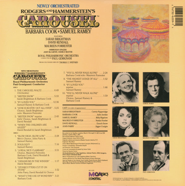 First Digital Recording Newly Orchestrated Featuring Barbara Cook and Samuel Ramey Cast, in order of appearance: SARAH BRIGHTMAN — Carrie Pipperidge BARBARA COOK — Julie Jordan SAMUEL RAMEY — Billy Bigelow MAUREEN FORRESTER — Nettie Fowler DAVID RENDALL — Enoch Snow JOHN PARRY — Jigger Craigin Recorded at Air Studios, London; March 9 through 13, 1987 & CBS Studios, London; May 1, 1987 Digital Systems: Sony 3324 & 3202 Digitally edited and mixed at Master Sound, Astoria, N.Y. Direct Metal Mastering at Precision Laquer, Hollywood, Ca. Cover art: monoprint & pastel by Irene Clark. Music Preparation by Colin Appleton Music Services (C) 1987 MCA Records, Inc. (P) 1987 MCA Records, Inc.