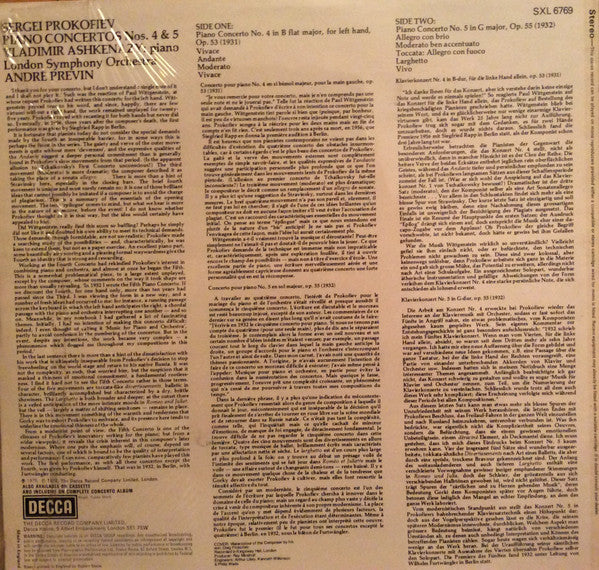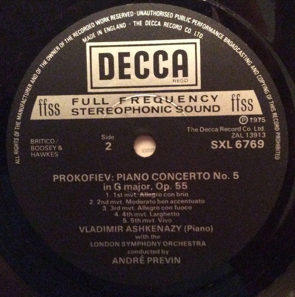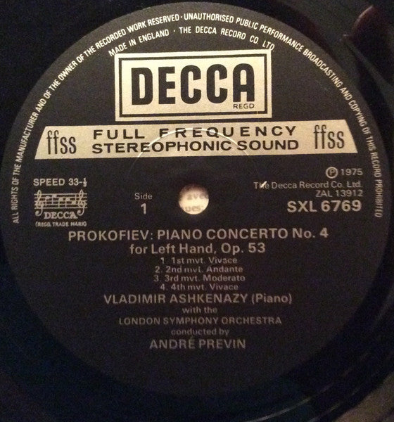 Labels: - Black/silver 'Narrow band' labels (ED4). - "Made in England" above boxed Decca print. - Decca 'Musical Notes" logo only on side A. - Matrix numbers printed on right side of spindle hole. Cover: - Only front is laminated. - Notes on the back in English, French and German. Catalog Numbers: - SXL 6769 on sleeve and labels. Other Information: - Full Frequency Stereophonic Sound. - Cover: Water color of the composer by his son, Oleg Prokofiev. - Ⓟ & Ⓒ The Decca Record Company Limited, London. - Ⓟ 1975. - Ⓒ 1976.