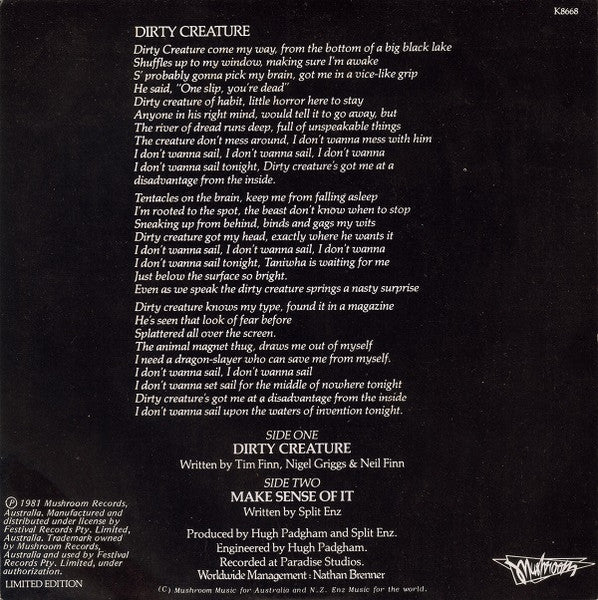 Picture sleeve, lyrics to Dirty Creature on reverse On the label the catalog no. appears as K-8668. In the runout matrix no.s on both sides, "TOWNHOUSE" is stamped, all other characters are hand-etched. Sleeve: ℗ 1981 Mushroom Records, Australia. Manufactured and distributed under license by Festival Records Pty. Limited, Australia. Trademark owned by Mushroom Records, Australia and used by Festival Records Pty. Limited, under authorization. LIMITED EDITION Recorded at Paradise Studios. Labels: MADE IN AUSTRALIA BY FESTIVAL RECORDS PTY. LTD. ℗ 1982 Mushroom Records Pty. Ltd., Aust. Aust. Recording.