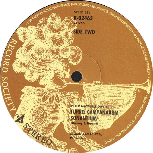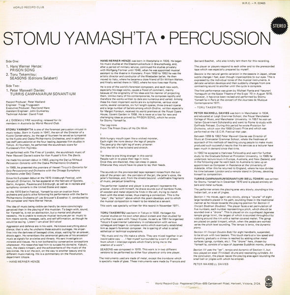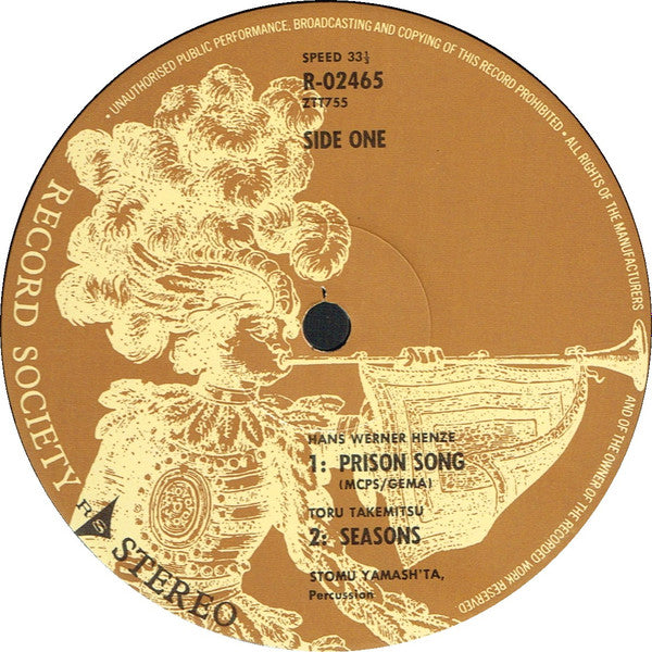 "Prison Song" composed in November 1971 for Stomu Yamash'ta. Lyrics from "The Prison Diary". "Seasons" composed in 1970, recorded live in Paris at the concert of the "Journées Musique Contemporaine" 1971. "Turris Campanarum Sonantium" composed in December 1970 for Stomu Yamash'ta. Australian WRC pressing, sourced from original stampers and featuring unique sleeve art. "World Record Club" on the sleeve, "The Record Society" on the labels. Not issued on other formats. Issued in a single sleeve. World Record Club: Registered Office - 605 Camberwell Road, Hartwell, Victoria, 3124.