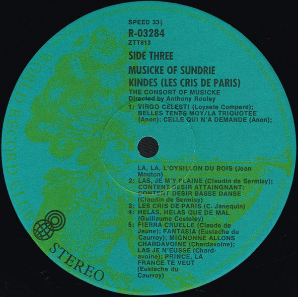 "An EDTION DE L'OISEAU-LYRE, released for its members in Australia by World Record Club." Lavender cover to the box, white lining. Issued with a 12-page black and white 12" x 12" booklet, with notes and sung-texts in English, French, Italian and German. It also has a track and credit list, photos and a source list. Not issued on other formats. Issued again in January 1978. Box cover illustration: Detail from Lucas van Leyden - 'Music Making Couple', 1524 (Museum Boymans van Beuningen, Rotterdam) Booklet cover illustration: Lucas van Leyden - 'Music Making Couple', 1524 (Museum Boymans van Beuningen, Rotterdam). World Record Club: Registered Office - 605 Camberwell Road, Hartwell, Victoria, 3124.