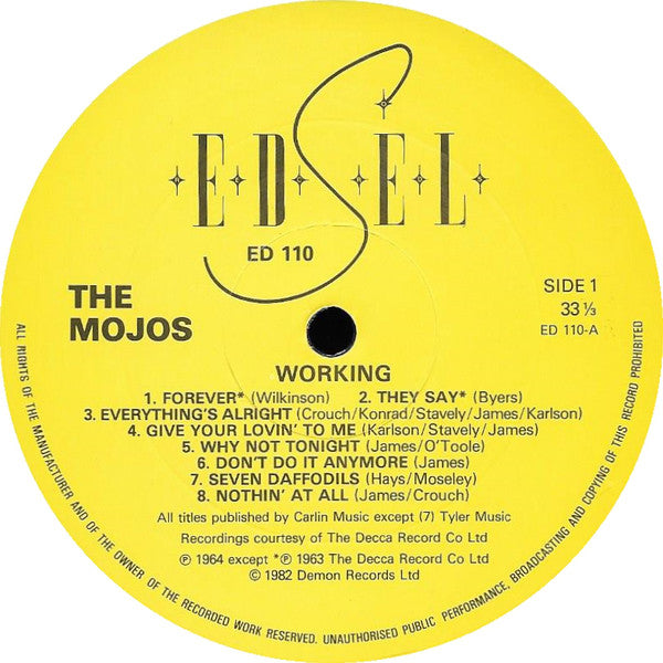 Recordings courtesy of The Decca Record Company. The Mojos story enclosed as 4 page folder. All titles published by Carlin Music except A7: Tyler Music; B1: Unknown; B3: George Wiener; B6: Carlin Music/Kenny Lynch. ℗ 1963 (A1, A2), ℗ 1964 (A3 to B3), ℗ 1965 B4 to B7.