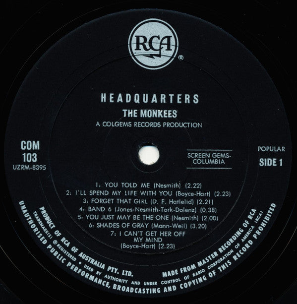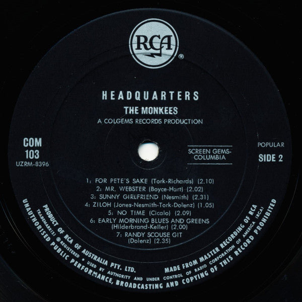 Label variation to [r=15119635 : - The words "A Colgems Records Production" underneath The Monkees is in standard capital letters, not in Italics - The publishing logo has "Columbia" in all capital letters without brackets Track B4 on the label is incorrectly spelt "Ziloh" instead of "Zilch". The correct spelling is on the back cover. Product of RCA of Australia Pty. Ltd. Made from Master Recording of RCA. A Colgems Records Production Cover displays both mono & stereo catalogue numbers. Labels show just mono number. Front cover is laminated, flipback back cover. Trademark(s) used by authority and under control of Radio Corporation of America (RCA) trademark(s) (R) registered. Write to the: Monkees Fan Club P.O. Box 17 Rozelle, N.S.W., Australia on the back cover The code X567 bottom right hand corner of the Back Cover indicates the scheduled month and year of original release. X567 = May 1967.