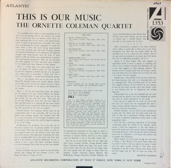 The Ornette Coleman Quartet - This Is Our Music - LP, Album, Mono, MGM - Good (G)