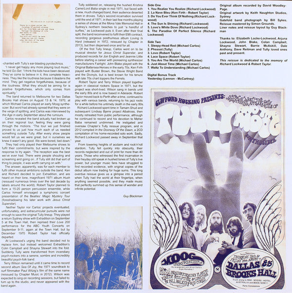 2014 reissue with gatefold cover. Includes download card and unreleased 1969 bonus track. Includes a 4-page 12x12 booklet with liner notes by Guy Blackman. Digital Bonus Track: Yesterday (Lennon - McCartney) Hype sticker on shink: 1970 first album from Australian psych heroes in towering avant-rock mode Tully Includes download card + unreleased 1969 bonus track [Chapter Music logo