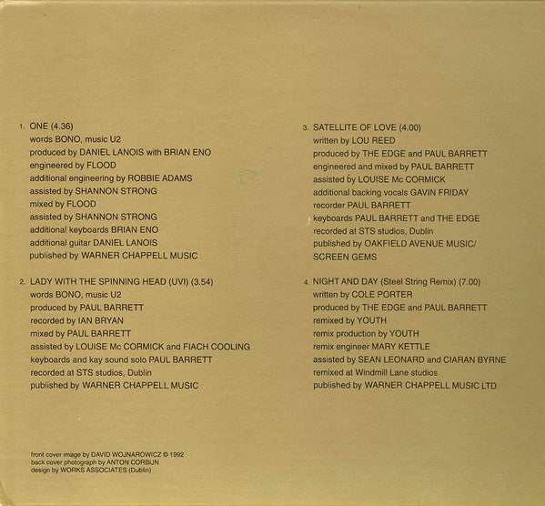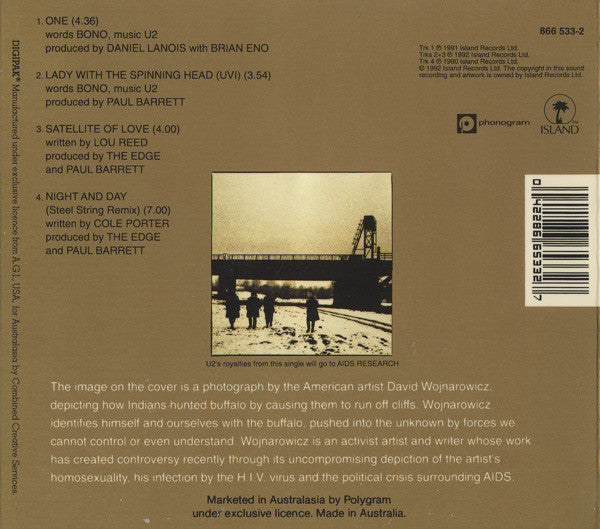Trk 1 ℗ 1991 Island Records Ltd. Trks 2+3 ℗ 1992 Island Records Ltd. Trk 4 ℗ 1990 Island Records Ltd. © 1992 Island Records Ltd. Publishers: 1, 2: Warner Chappell Music. 3: Oakfield Avenue Music/Screen Gems. 4: Warner Chappell Music Ltd. The image on the cover is a photograph by the American artist David Wojnarowicz, depicting how Indians hunted buffalo by causing them to run off cliffs. Wojnarowicz identifies himself and ourselves with the buffalo, pushed into the unknown by forces we cannot control or even understand. Wojnarowicz is an activist artist and writer whose work has created controversy recently though its uncompromising depiction of the artist's homosexuality, his infection by the H.I.V. virus and the political crisis surrounding AIDS. U2's royalities from this single will go to AIDS RESEARCH. Marketed in Australasia by Polygram under exclusive licence. Made in Australia. DIGIPAK Manufactured under exclusive license from A.G.I., USA, for Australasia by Combined Creative Services.