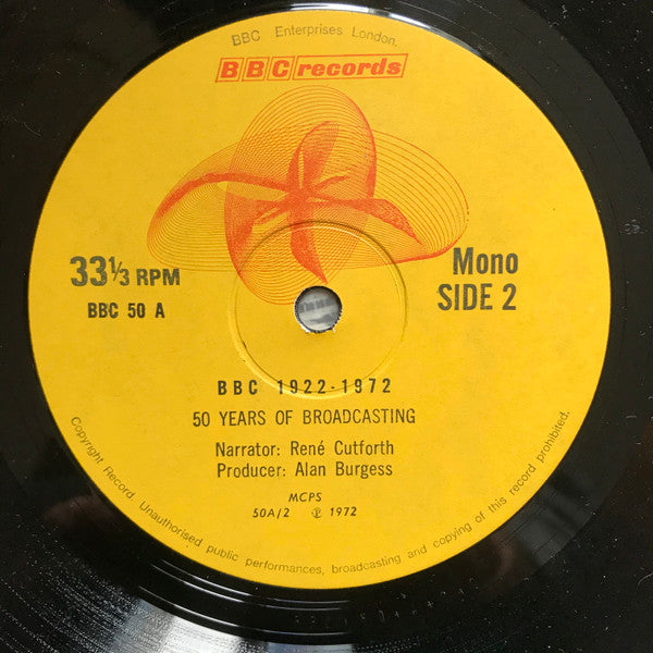 Audio documentary covering 50 years of the British Broadcasting Corporation adapted from the Radio 4 series 'Fifty Broadcasting Years'. Released in a gatefold sleeve. Track B1 noted as Symphony Orchestra