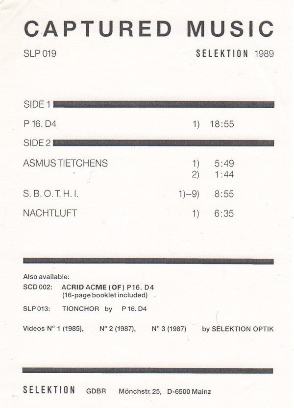 Issued with b&w Selektion flyer (21 x 15 cm.) Captured Music-Festival 25th - 27th February 1987, Karlsruhe, Germany organized by Manfred Reichert and the Ensemble 13. Side 1: Transformation by P16.D4. from the basic material provided by The Hafler Trio, Nicolas Collins, Christian Marclay, Nachtluft, P16.D4, Psychic Television (Genesis and Paula P-Orridge), S.B.O.T.H.I., Elliott Sharp and Asmus Tietchens. Side 2: Further transformations of side 1 by Asmus Tietchens, S.B.O.T.H.I., and Nachtluft.