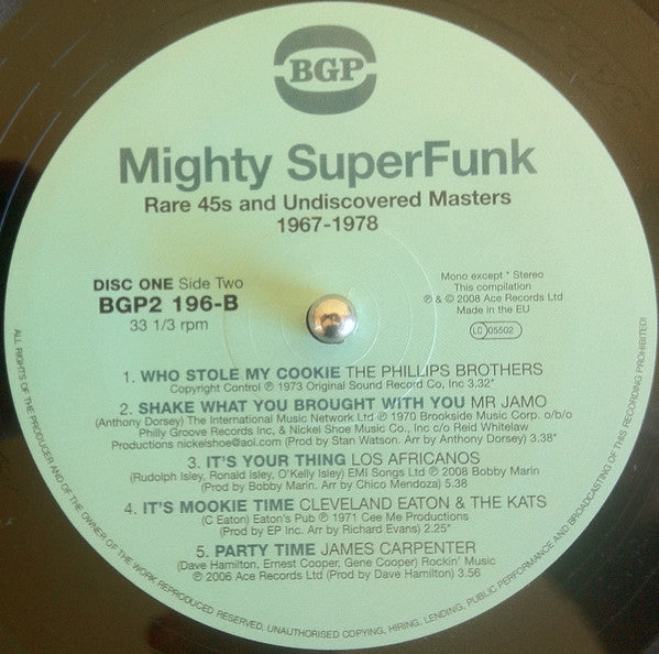 Superfunk returns chock-full of rare and unreleased funk masterpieces A1) Cherry Red 4504 (1971) A2) Previously unissued Gator recording (2008) A3) Previously unissued Cotique recording (2008) A4) Flodavieur 807 (1969) A5) Cle An Thair 7727/7728 (1971) B1) Now 5 (1973) B2) SSS International 798 (1970) B3) Previously unissued 1975 recording (2008) B4) Cle An Thair 7731/7732 (1971) B5) Originally unissued Dave Hamilton recording BGP CDBGPD 177 (2006) C1) Previously unissued GSR recording (2008) C2) Westbound 5021 (1976) C3) From the Motion Picture "It's A New Day" Jo Jo 102/103 (1969) C4) Previously unissued Sylvia recording (2008) C5) Romark 117 (1969) D1) Valise 6904/5 (1967) D2) Previously unissued GSR recording (2008) D3) Kent 490 (1968) D4) Canyon LP 7712 (1970) D5) Dore 844 (1970)