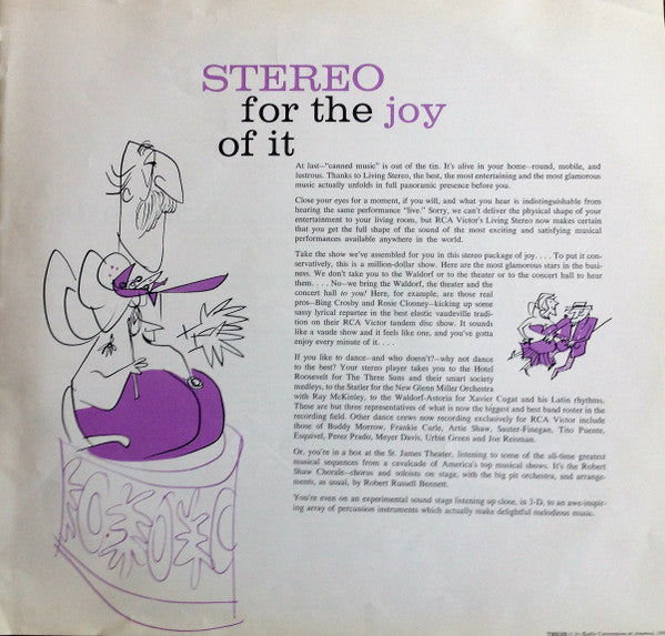 Box set of 10 LPs (including artwork) and an 8-page booklet with new liner notes for each release, bound into an oversize book. Intended as a showcase of RCA's then-fledgling Stereo catalog. Each record comes in a top-opening paper jacket with the standard album artwork, which is ring-bound into the book along the left margin. Contains the following discs (records themselves are same as standard releases): Disc 1 (LSP-1759) [r=1828499 Disc 2 (LSP-1854) [r=2085931 Disc 3 (LSP-1882) [r=2085936 Disc 4 (LSP-1680) [r=2085937 Disc 5 (LSP-1866) [r=2085948 Disc 6 (LSP-1734) [r=2085955 Disc 7 (LSC-2231) [r=2085968 Disc 8 (LSP-1678) [r=2085983 Disc 9 (LSP-1971) [r=2086012 Disc 10 (LSP-1000) [r=2086013