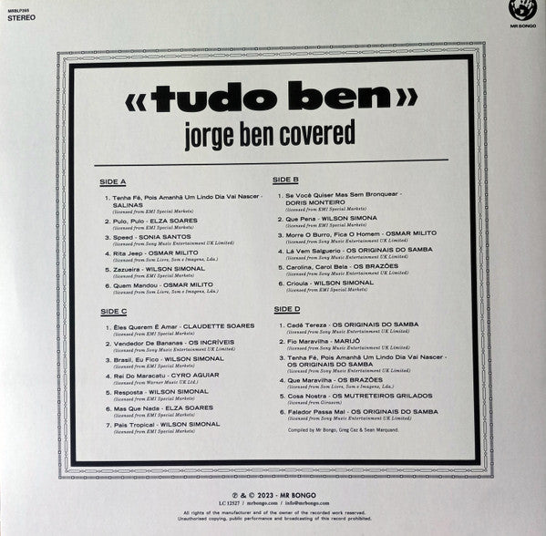 Sticker on cellophane: Responsible for one of the finest back catalogues in Brazilian music, this compilation of cover versions celebrates Jorge Ben's illustrious songwriting. Feat. Elza Soares, Wilson Simonal, Os Brazões & more. ℗ & © 2023 - Mr Bongo