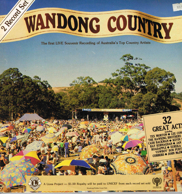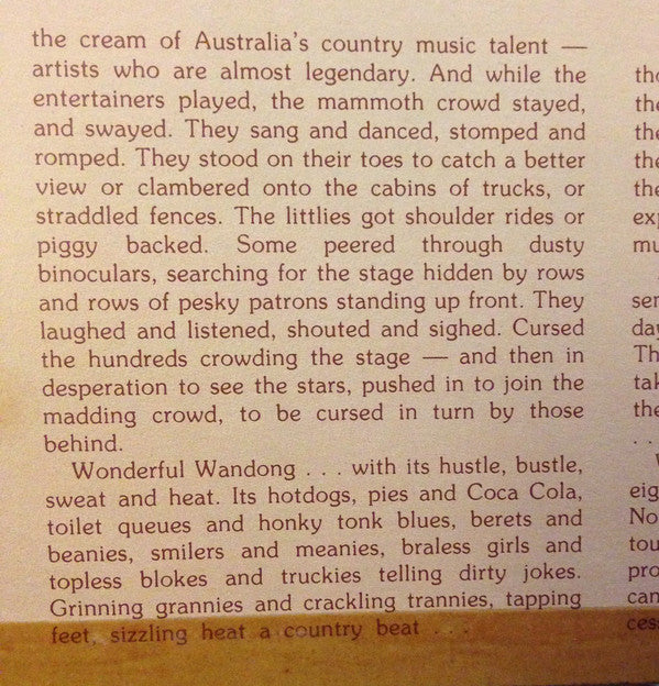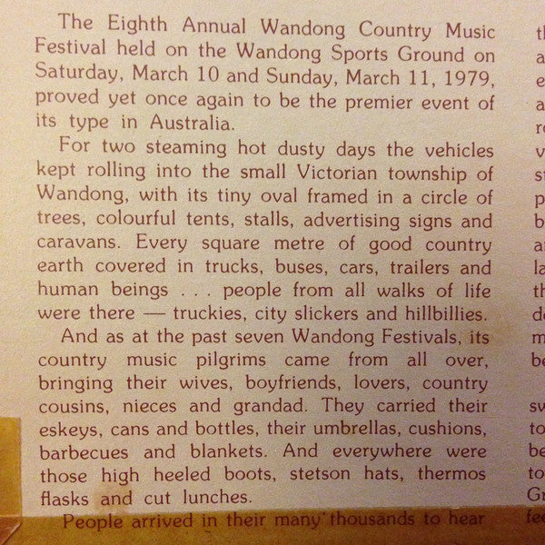 The Eighth Annual Wandong Country Music Festival held on the Wandong Sports Ground on Saturday March 10th & Sunday March 11th The first LIVE souvenir recording of Australia's Top Country Artists. A Lions Project -$1.50 royalty will be paid to UNICEF from each record set sold. Recorded at the 1979 Wandong Country Music festival . (Victoria, Australia)