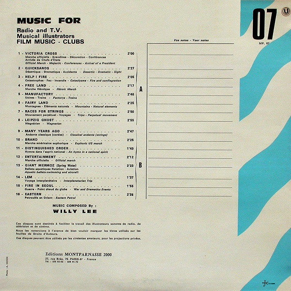 Music For Radio and T.V., Musical Illustrators, Film Music - Clubs Ces disques sont destinés à faciliter le travail des illustrateurs sonores de radio, de télévision et de cinéma. Nous les remercions à l'avance de bien vouloir marquer les titres utilisés sur les feuilles de Droits d'Auteurs. Ces disques peuvent être utilisés par les cinéastes amateurs, pour les projections privées. [These records are intended as sonic backgrounds for radio, television and cinema. We give our thanks in advance for crediting these compositions on copyright forms. These records can be used by amateur filmmakers, in private screenings.