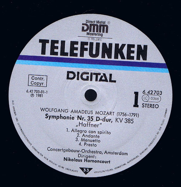 Made in Germany ∙ TELDEC »Telefunken-Decca« Schallplatten GmbH, Hamburg (Western Germany) Ⓟ1981. The gate-fold sleeve contains notes in German, English and French. The gate-fold sleeve is totally embossed (outside & inside) with a woven fabric structure. Digital Recording - Stereo. Direct Metal Master Cover illustration: "Perspective drawing of the Large Hall of the Concertgebouw"; design: A.L. van Gendt; drawing: E. Breman. Back cover illustrations: 1st leaves of the autographs of the performed symphonies by Mozart.